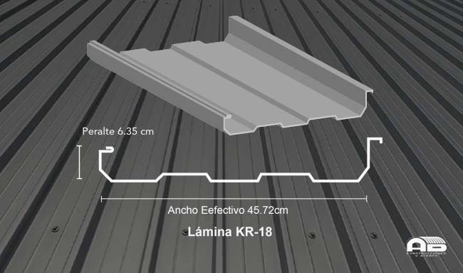 La lámina KR-18 es engargolada y permite formar cubiertas de un solo cuerpo a una infraestructura de acero. Es utilizada en proyectos de grandes dimensiones (naves industriales, cedis, plantas, faldones, fachadas, etc).